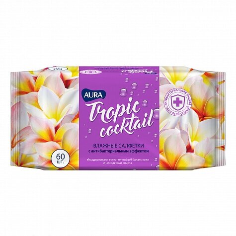 Влажные салфетки Aura Tropic Cocktail, c антибактериальным эффектом, 60 шт.