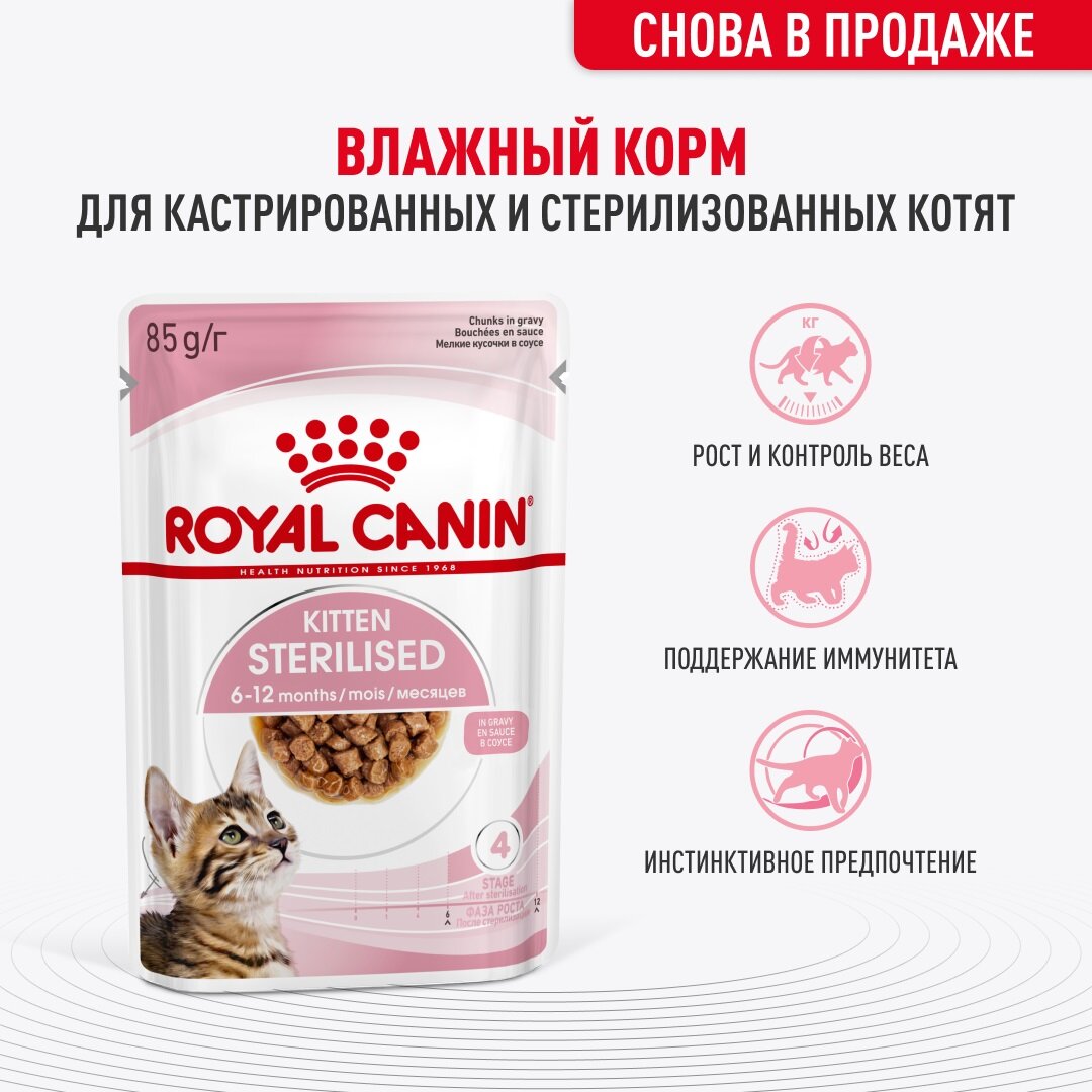 Купить Royal Canin Kitten Sterilised влажный корм для стерилизованных котят в возрасте от 6 до 12 месяцев, мелкие кусочки в соусе, в паучах - 85 г
