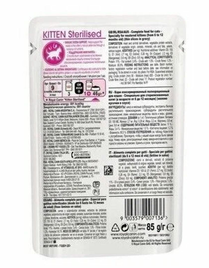 СохранитьRoyal Canin Kitten Sterilised влажный корм для стерилизованных котят в возрасте от 6 до 12 месяцев, мелкие кусочки в соусе, в паучах - 85 г интересное: