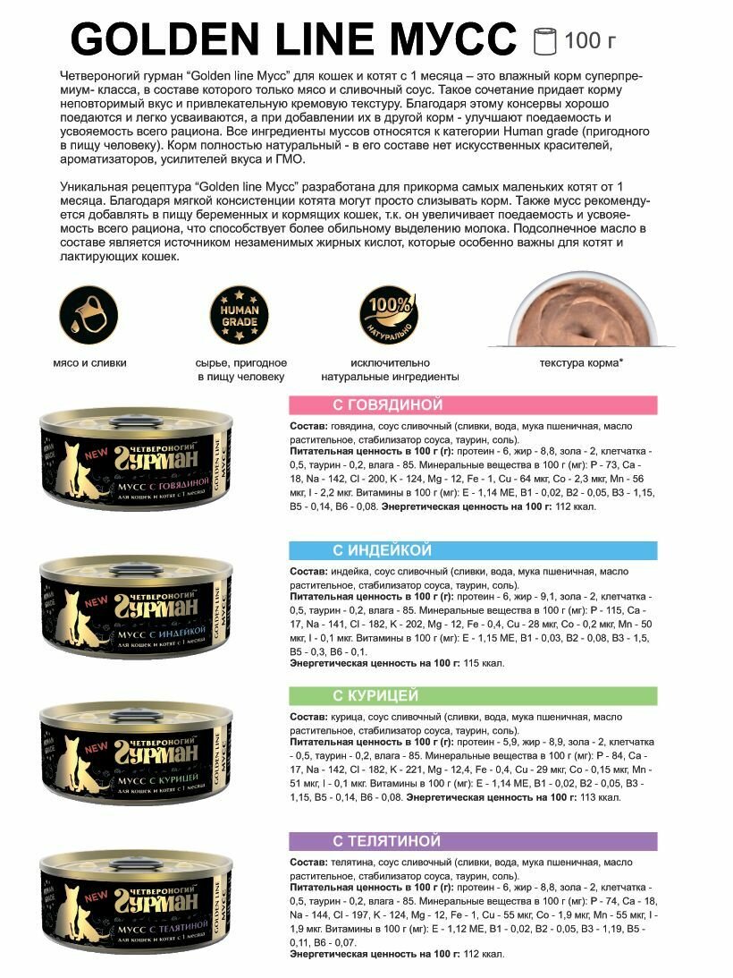 Четвероногий гурман GOLDEN LINE для кошек и котят мусс с телятиной банка 100 гр NEW 100 гр х 6 шт