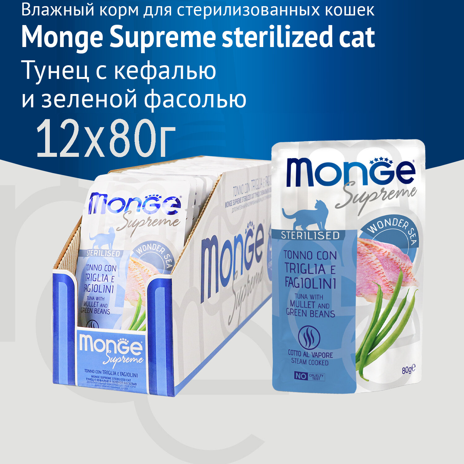 Купить Влажный корм Monge Supreme sterilized cat для стерилизованных кошек с кефалью и зелёной фасолью, паучи 12 шт х 80 г