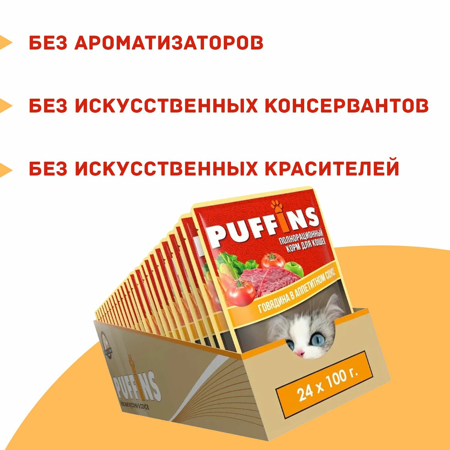PUFFINS для взрослых кошек с говядиной в аппетитном соусе (100 гр х 24 шт)
