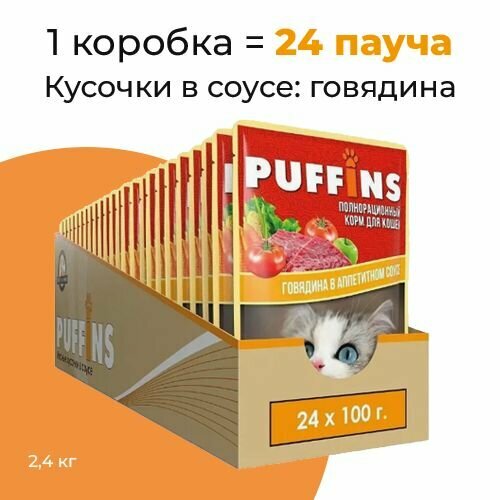 Влажный корм "Puffins" для кошек, сочные кусочки говядины в соусе, 100 г(24 шт.)