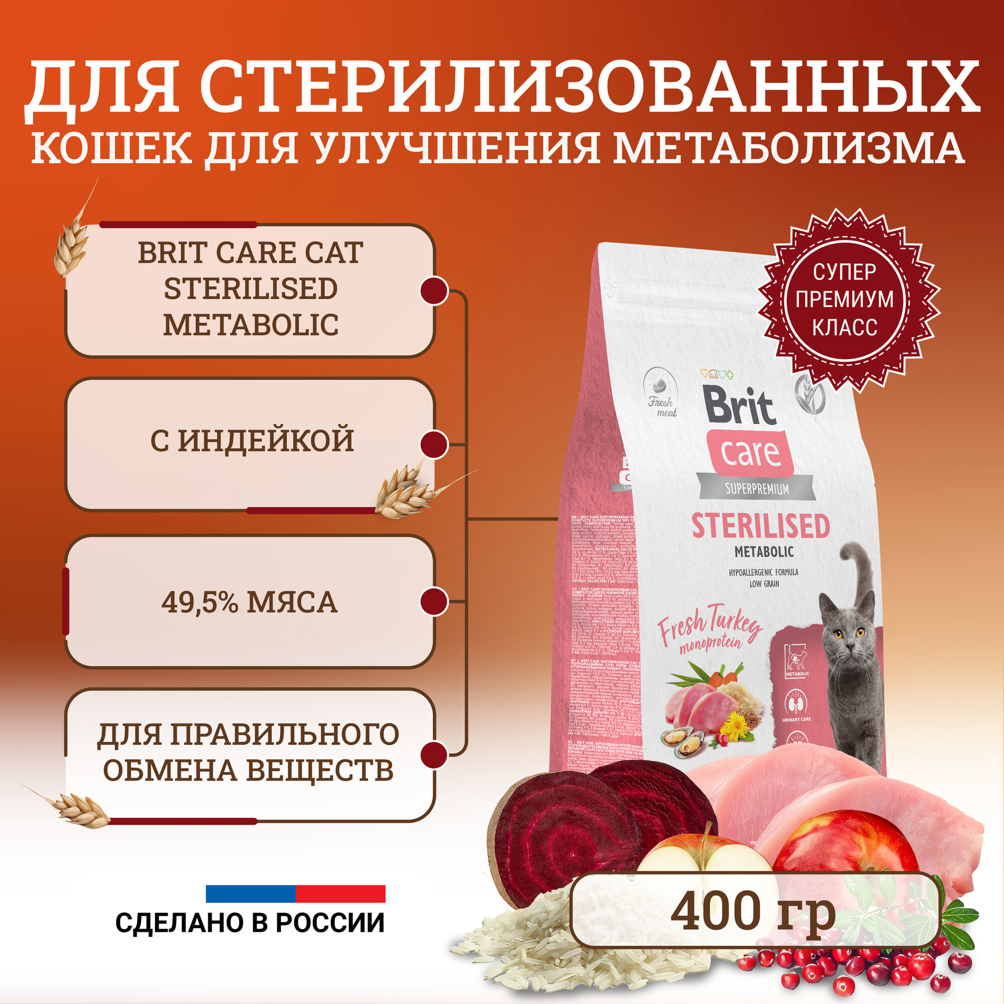 BRIT CARE, Сухой корм с индейкой для стерил. кошек "Cat Sterilised Metabolic", 0.4 кг