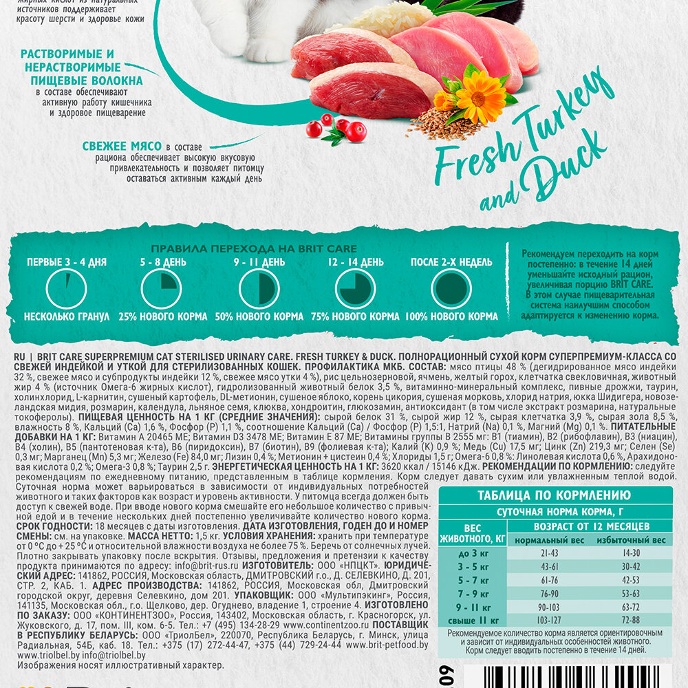 Купить Брит Care 5066209 Сухой корм с индейкой и уткой д/стер.кошек "Cat Sterilised Urinary Care", 1.5кг