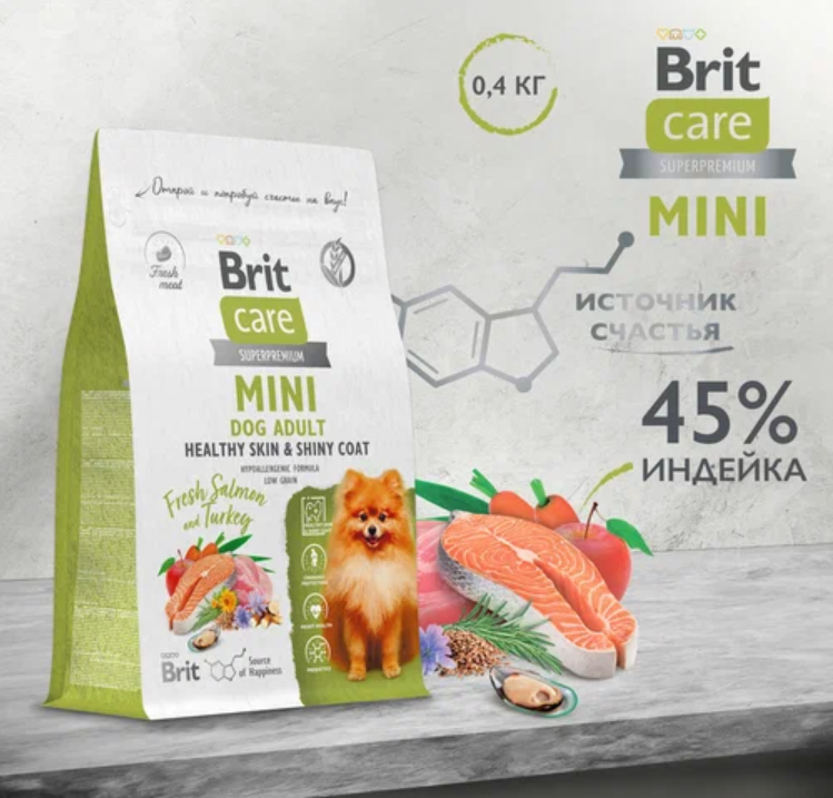 Brit Care Mini Adult Healthy Skin&Shiny Coat сухой корм для взрослых собак мелких пород, с лососем и индейкой - 400 г