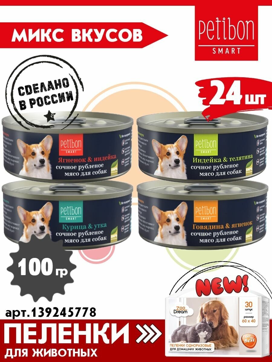 Корм консервированный для собак Petibon Smart Рубленое мясо микс из 4 вкусов, 100 г х 24 шт.