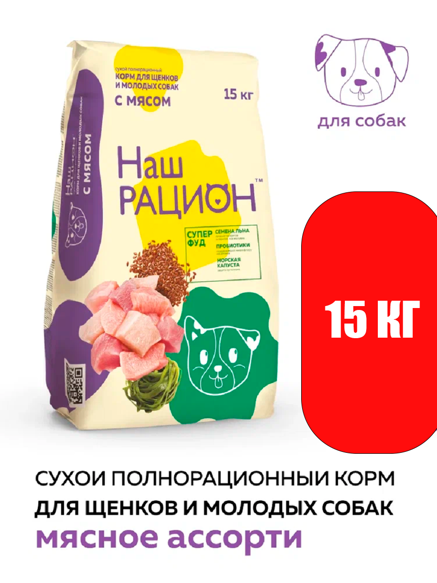 Сухой полнорационный корм Наш Рацион для щенков и молодых собак, мясное ассорти, 15 кг