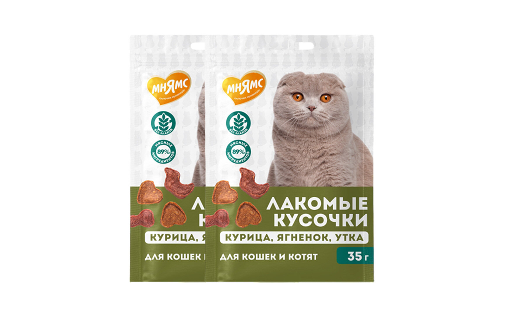 Купить Лакомство Мнямс для кошек и котят "кусочки ассорти" из курицы, ягненка и утки 35 г х 2 шт.