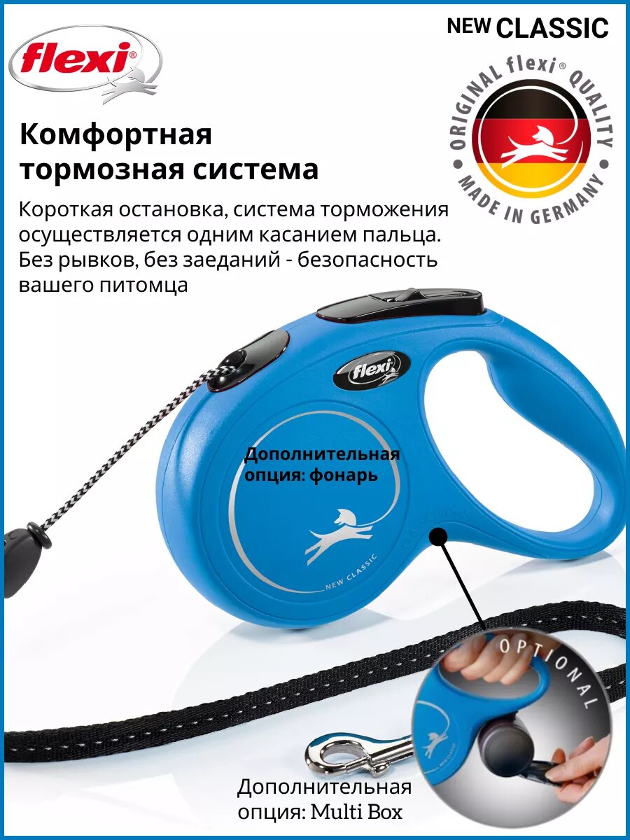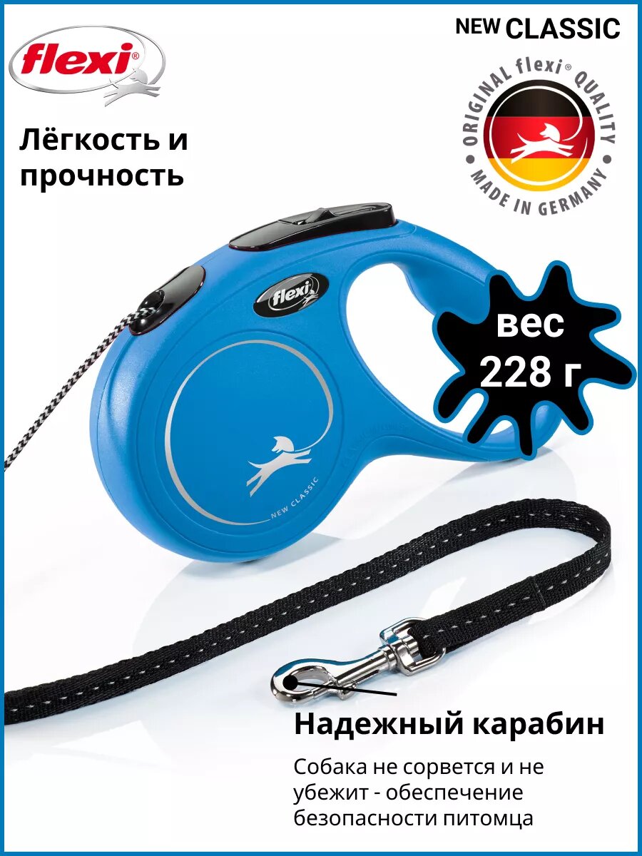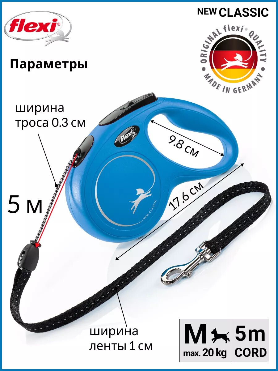 Купить Поводок - рулетка для собак Flexi New Classic M, трос 5 м, до 20 кг, синяя