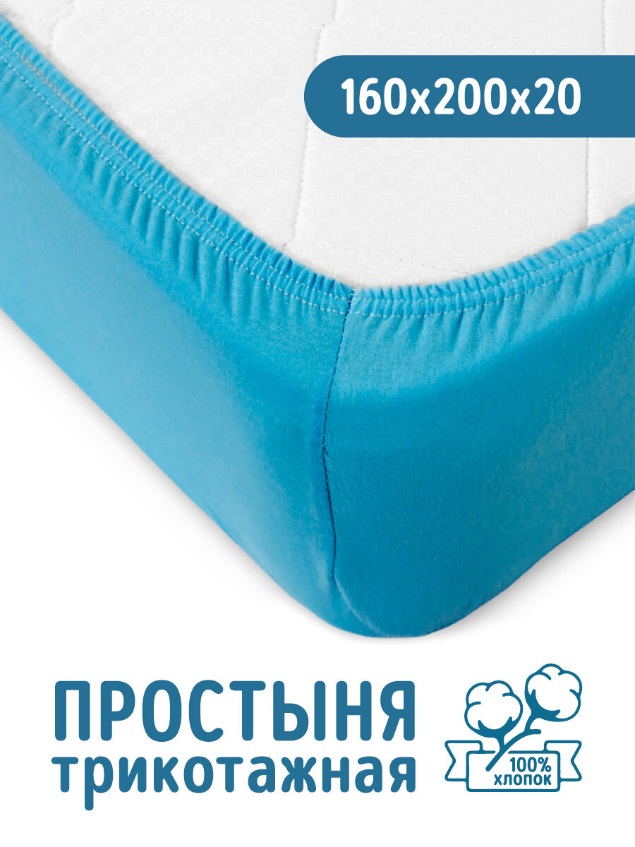 Трикотажная простынь на резинке 160х200 Небесный, 100% хлопок