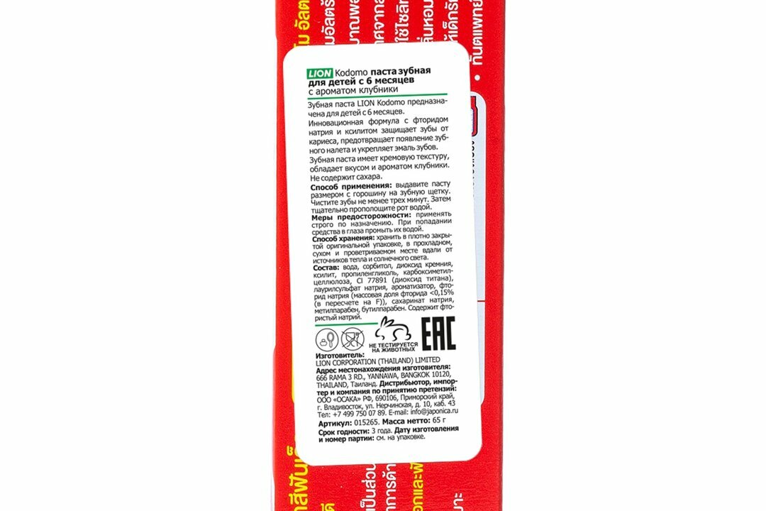 Lion Kodomo паста зубная для детей с 6 месяцев с ароматом клубники, 65 г