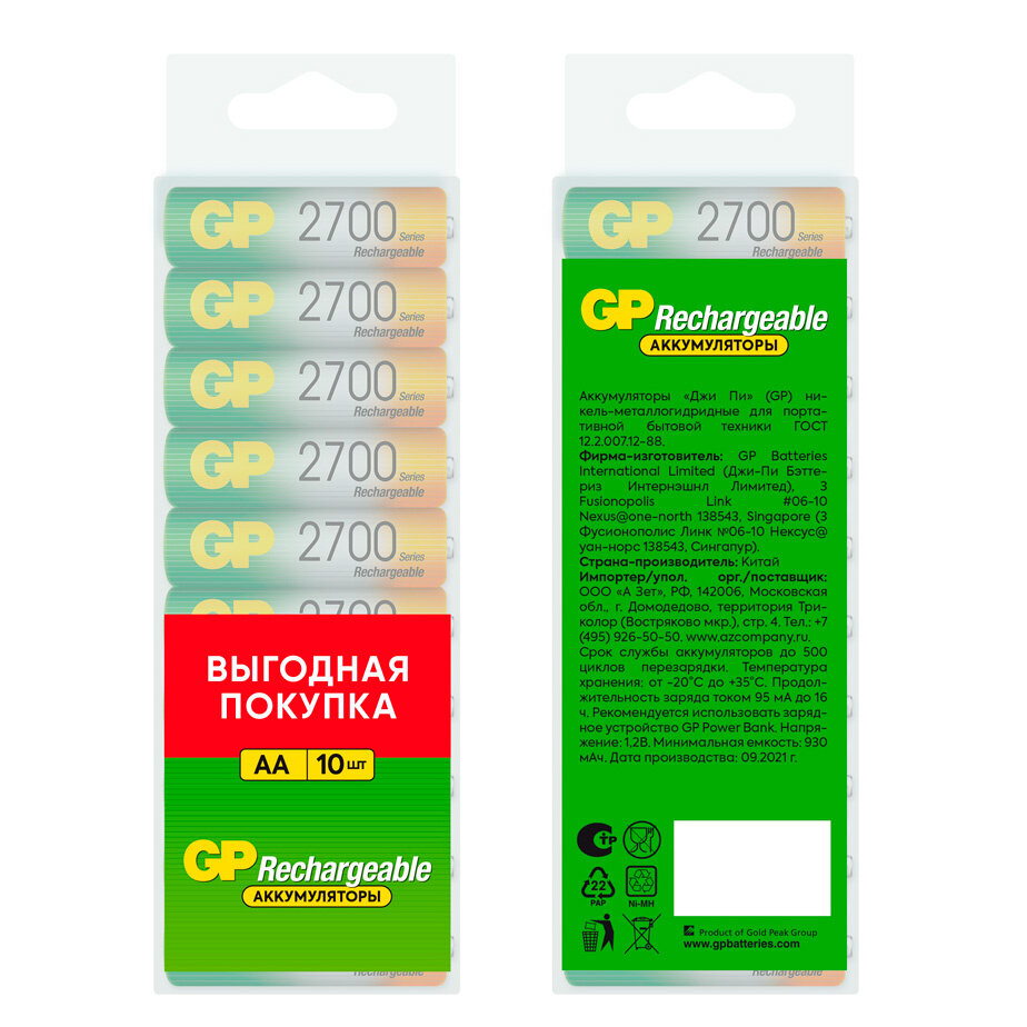 Купить Аккумуляторная батарейка AA GP 270AAHC, в комплекте 10шт. (270AAHC-CRB10)