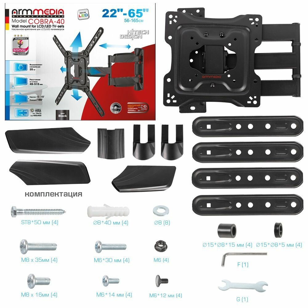 Кронштейн ARM Media COBRA-40 black, для LED/LCD TV 22"-65", max 35 кг, настенный, 4 ст свободы, max VESA 400x400 мм.