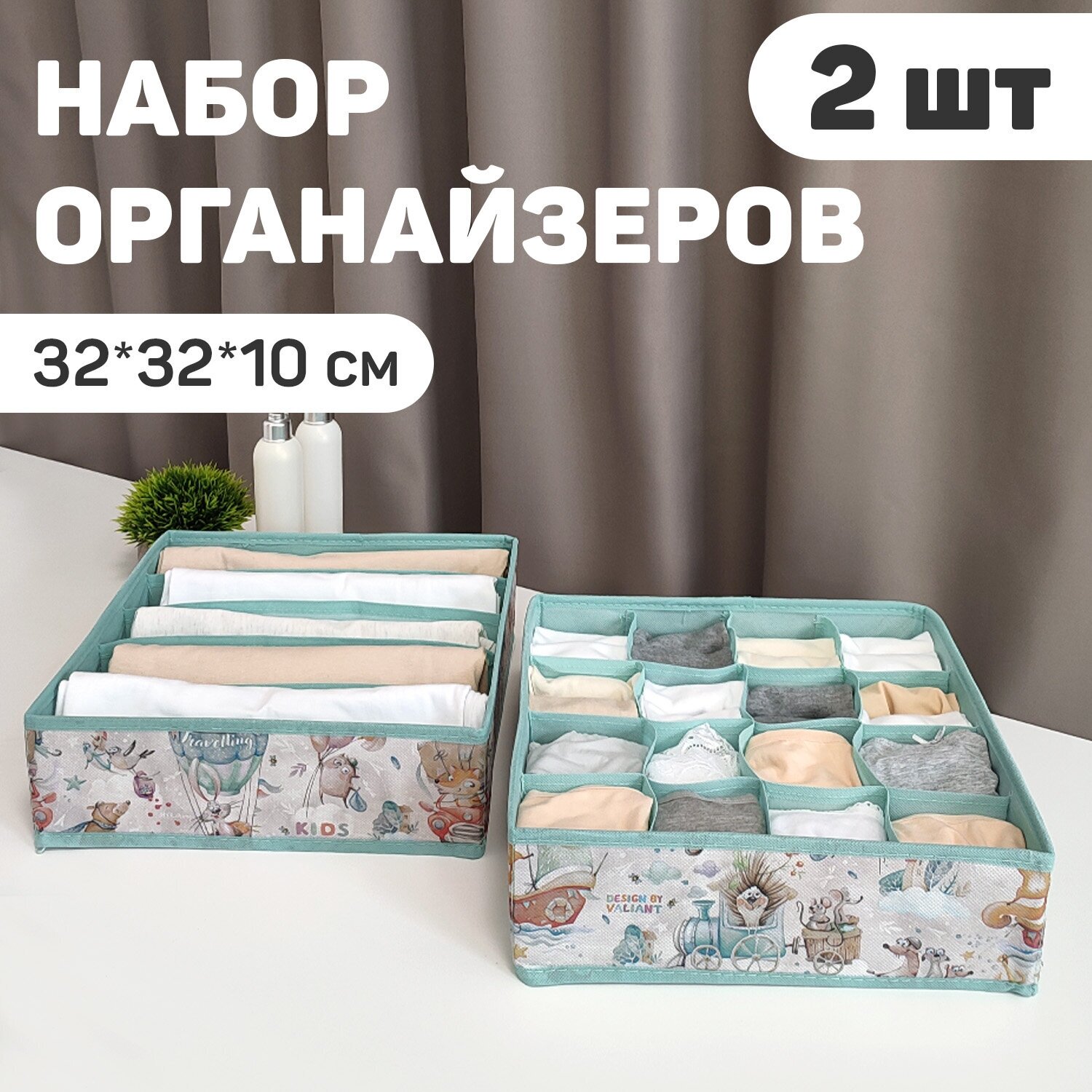 Набор органайзеров для белья, 2 шт., без крышки, 32*32*10 см, зел., любимчики