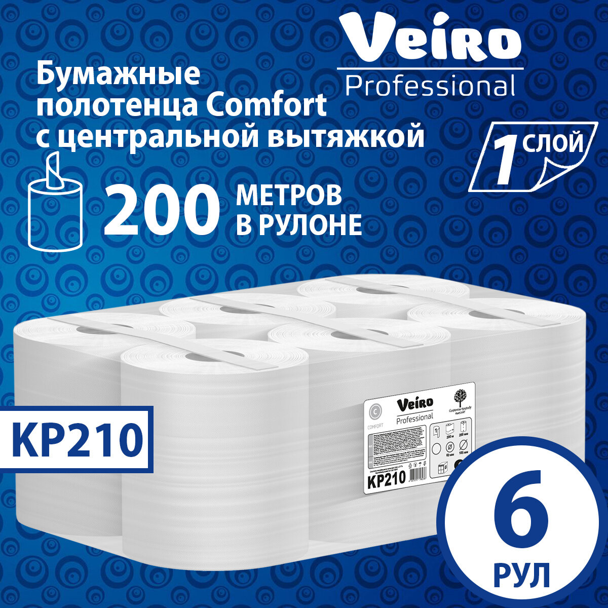 Полотенца бумажные с центральной вытяжкой 200 м, VEIRO (Система M2) COMFORT, 1-слойные, белые, комплект 6 рулонов, KP210, КР210 В наборе: 1компл.