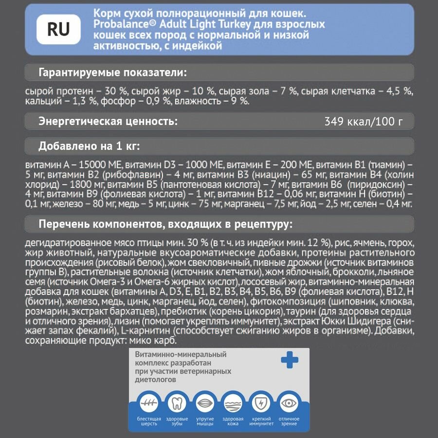 Сухой корм для кошек ProBalance Adult Light с индейкой, 10 кг