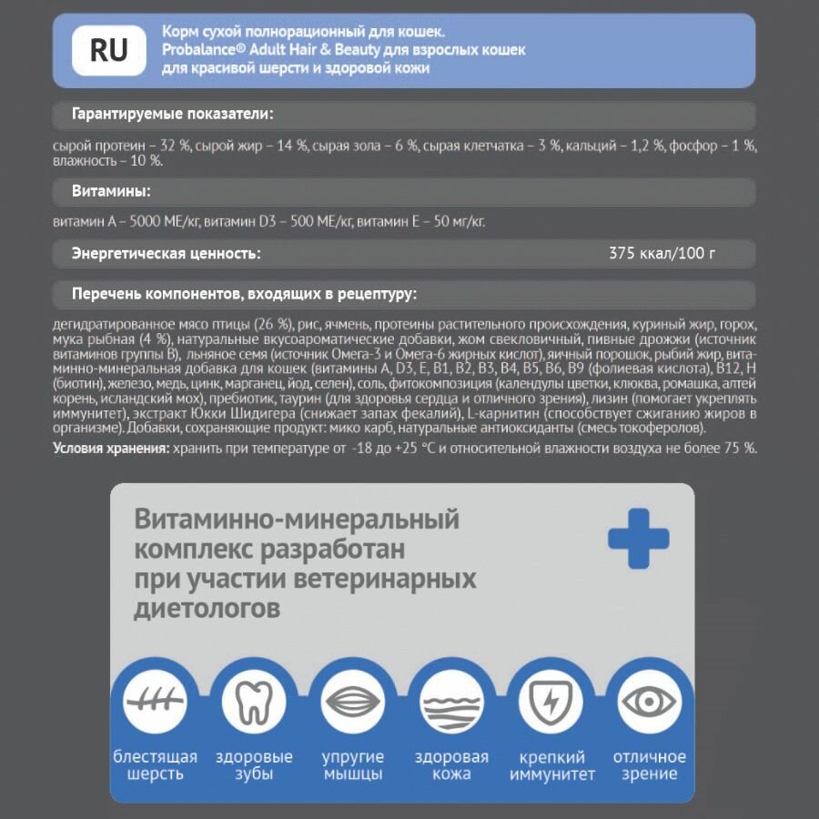 Сухой корм для кошек и котов Probalance Hair&Beauty, красота шерсти и кожи, 1,8 кг