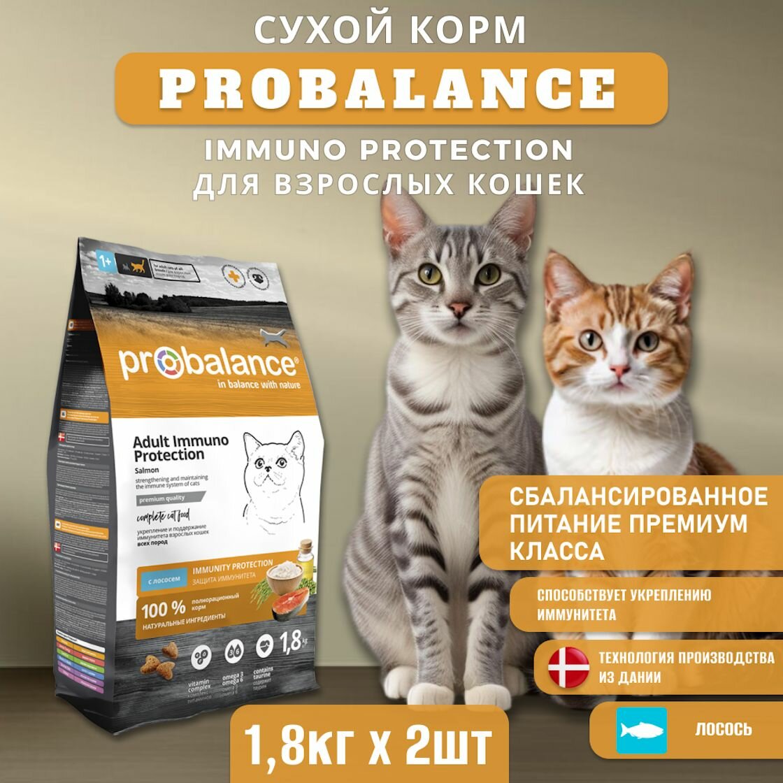Купить Сухой корм ProBalance Immuno Protection Salmon для взрослых кошек с лососем, 2 шт по 1,8 кг