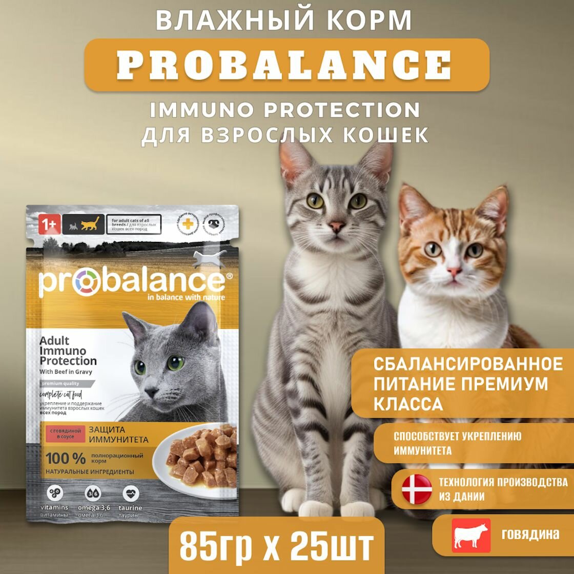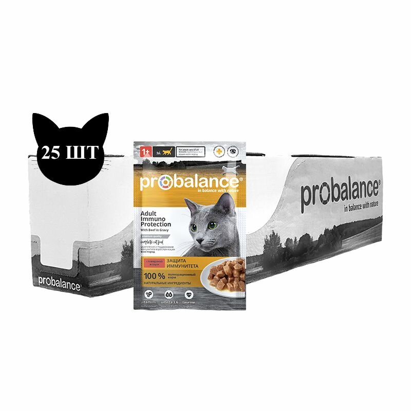 Купить Влажный корм ProBalance Immuno Protection для кошек с говядиной в соусе, пауч, 85гр x 25шт