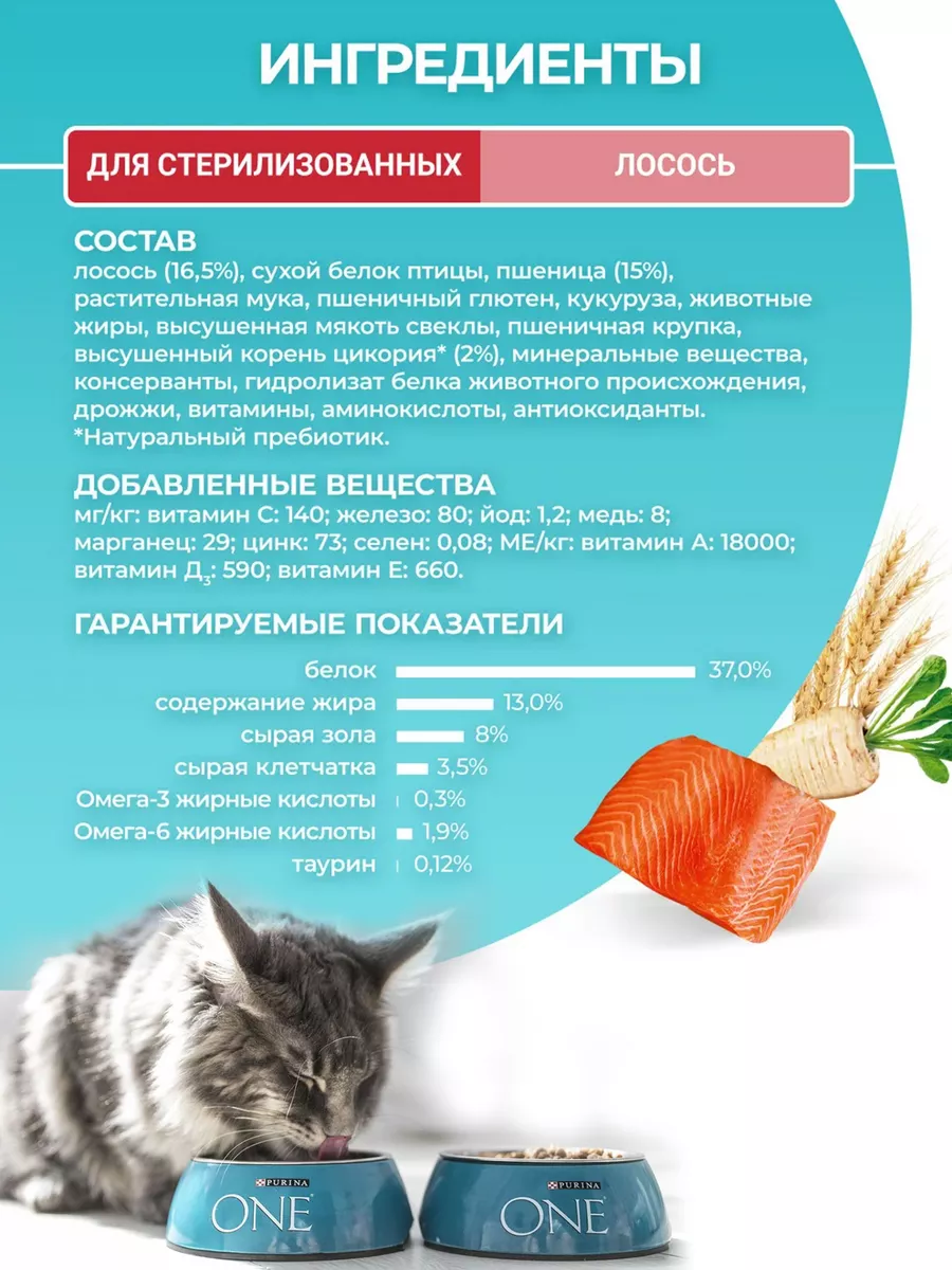 Сухой корм Purina ONE полнорационный для стерилизованных кошек и кастрированных котов, с высоким содержанием лосося, 1,5 кг