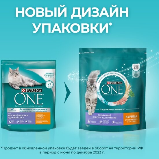 Сухой корм Purina ONE для кошек для красивой шерсти и контроля образования волосяных комков с курицей и цельными злаками, Пакет, 750 г,Для взрослых кошек
