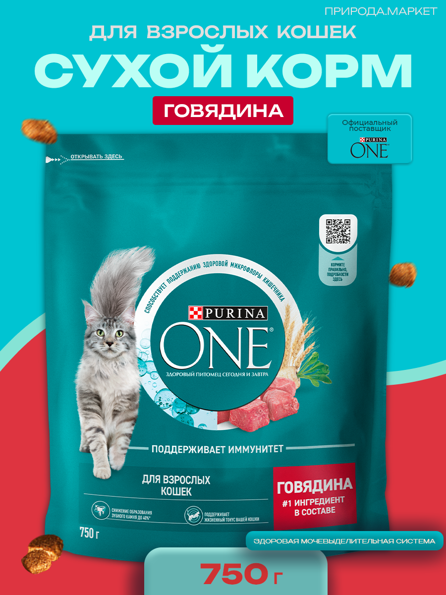 Купить PURINA ONE 750 г сухой корм для взрослых кошек, с высоким содержанием говядины