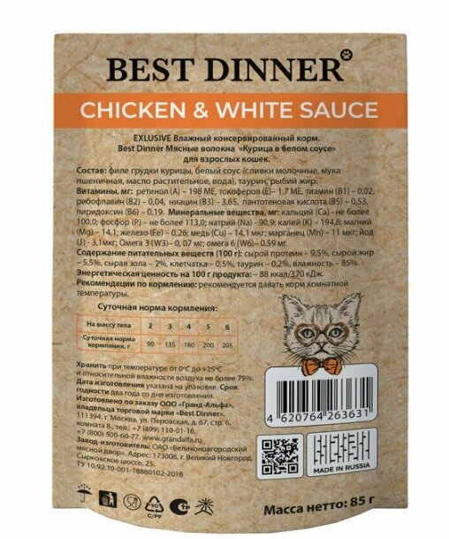 Корм влажный Best Dinner пауч для кошек Курица в белом соусе 85г , 24 шт