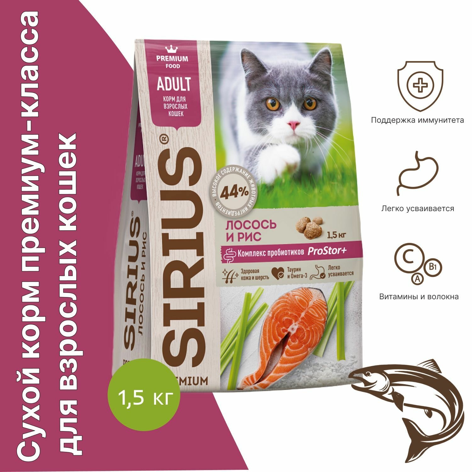 Сухой корм для кошек SIRIUS, лосось с рисом, 1,5 кг