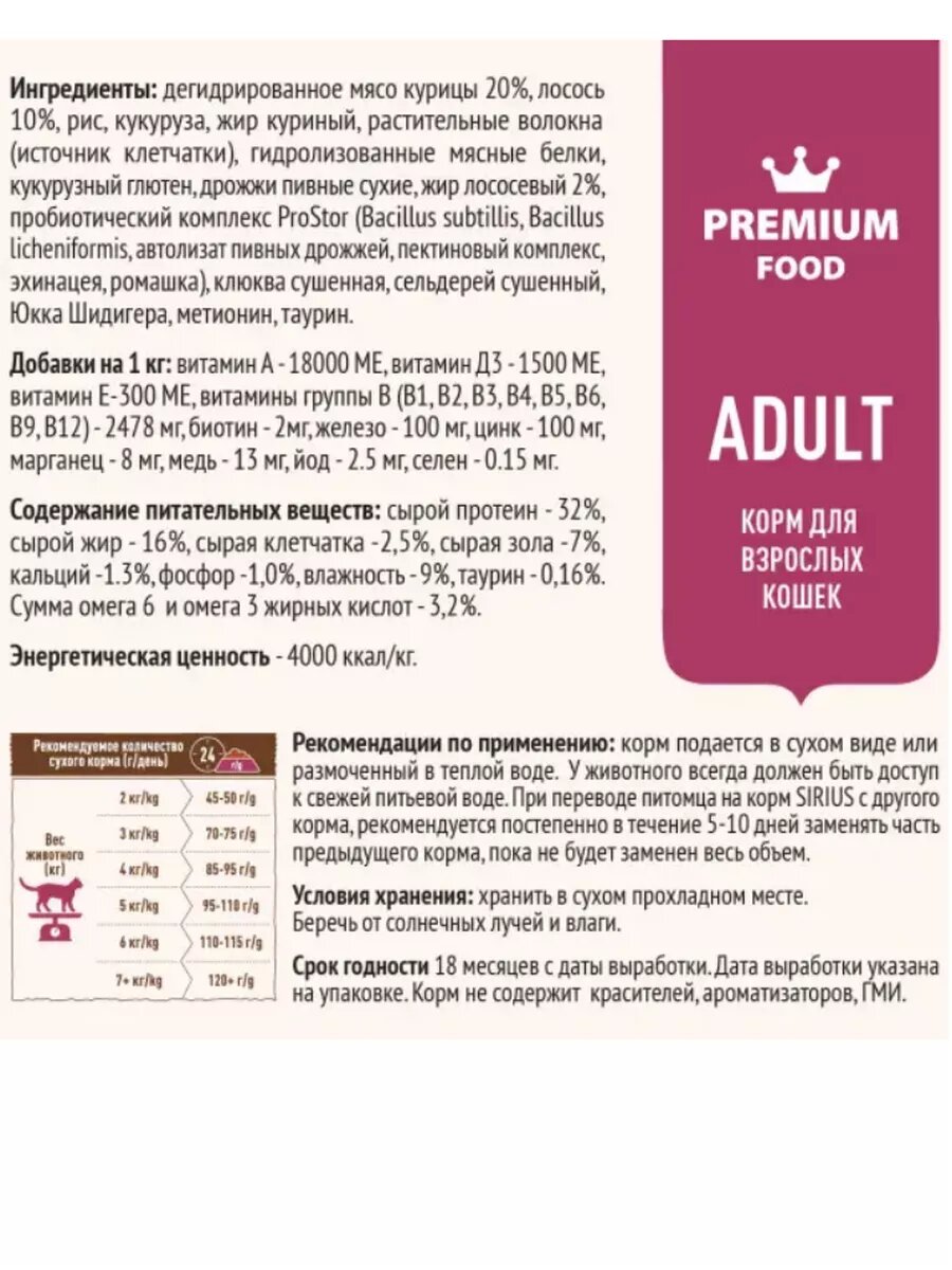 Сухой корм сириус SIRIUS PREMIUM для взрослых кошек, лосось и рис, 3 шт по 400 г