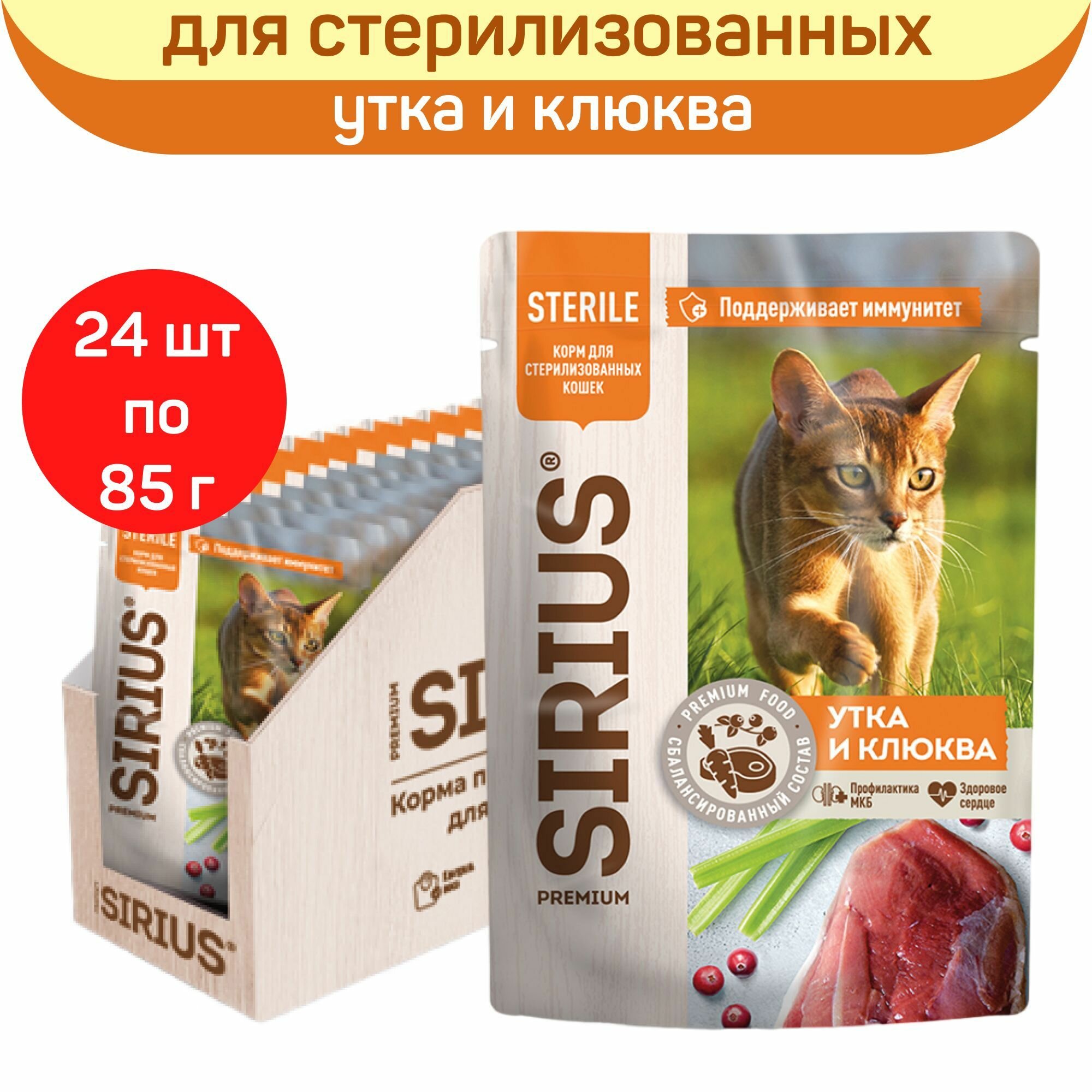 Влажный корм SIRIUS для кастрированных котов и стерилизованных кошек, утка с клюквой, пауч, 85гр*24шт