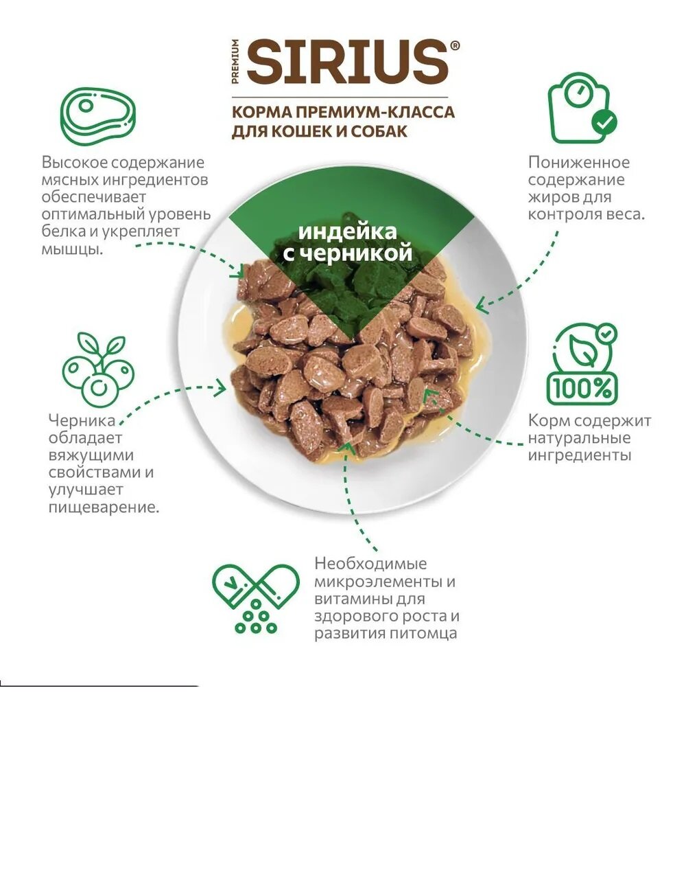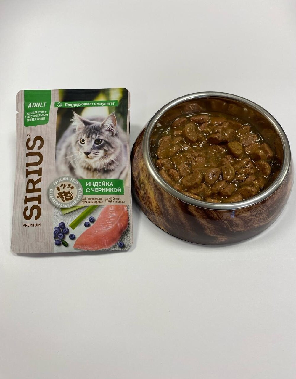 Влажный корм SIRIUS для кошек, индейка с черникой, пауч, 85гр*24шт