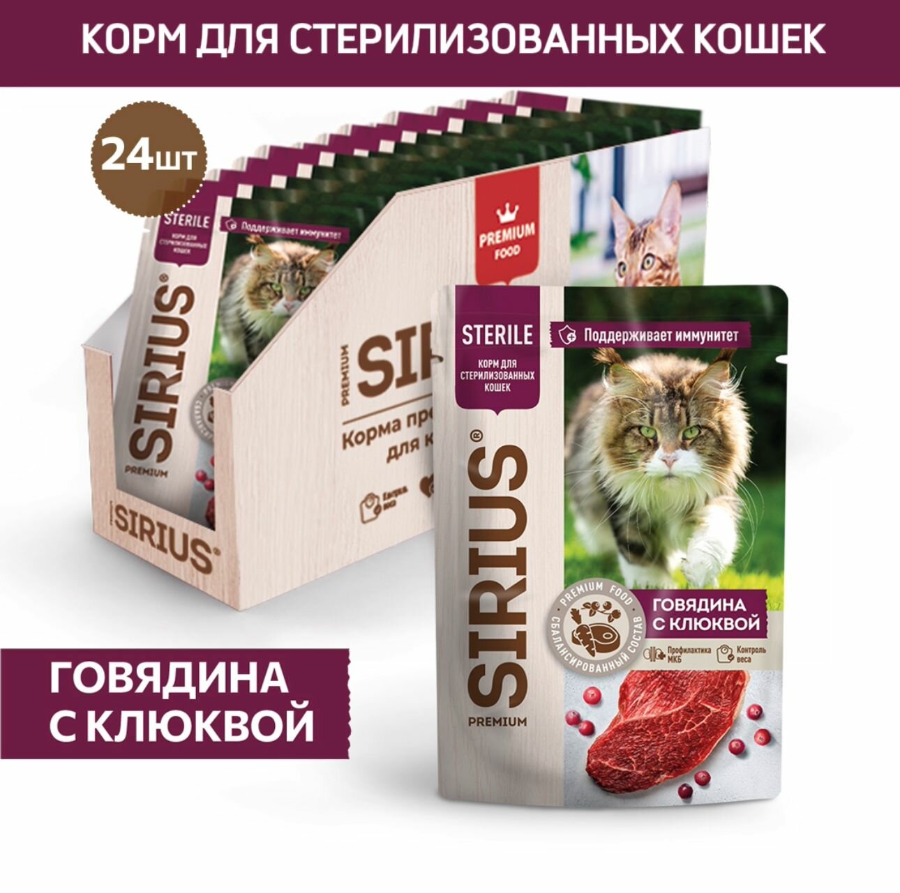 Влажный корм SIRIUS для кастрированных котов и стерилизованных кошек, говядина с клюквой, пауч, 85гр*24шт