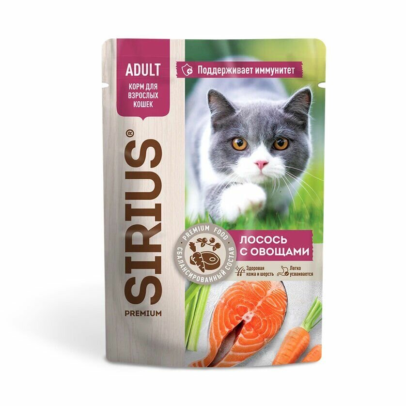 Влажный корм сириус SIRIUS для взрослых кошек, кусочки в соусе, лосось с овощами, 24 шт по 85 г