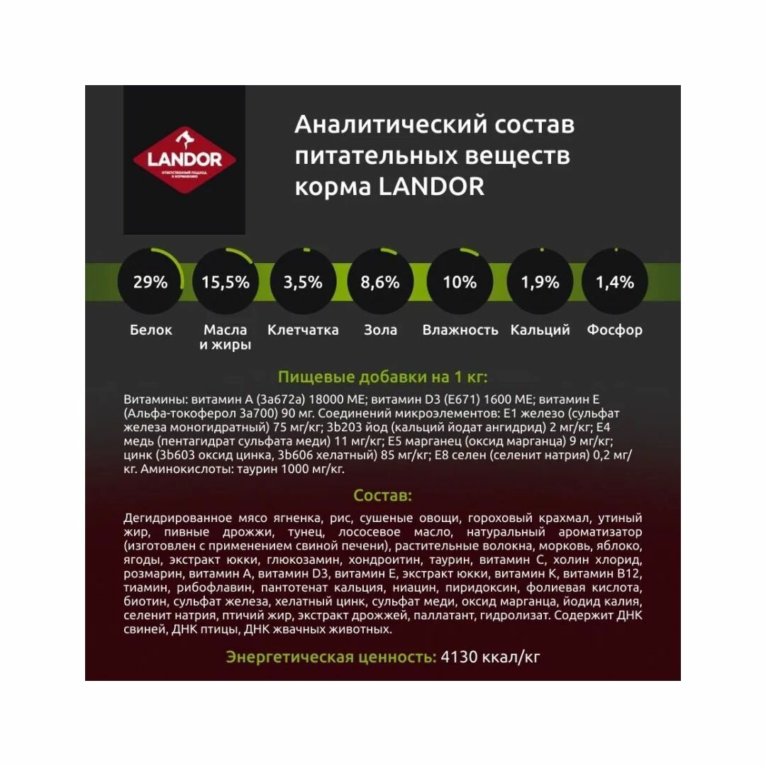 | Отзыв: | Чистый холистик. Производства Испании.Если сравнивать с холистиками других фирм, то Ландор 100% выигрывает по соотношению цена/качество. Если мы Леонардо, но цена за последний год неадекватно выросла и попробовали Ландор. Покупали на свой страх и риск.По составу тоже, а цена намного меньше.Коты довольны, хозяева тоже. |