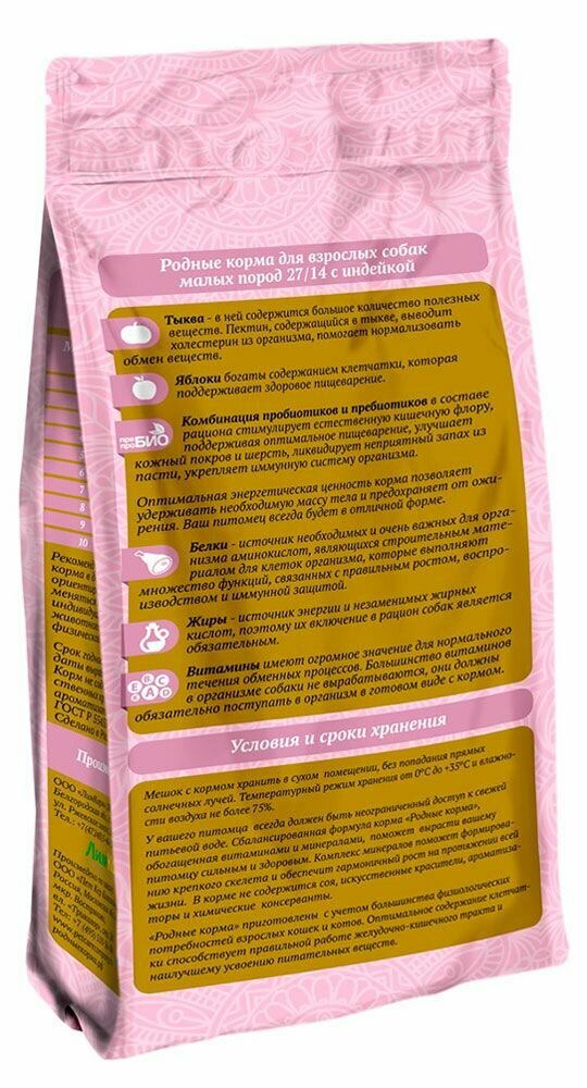 Корм сухой родные корма 27/14 5 русских фунтов для взрослых собак мелких пород, с индейкой 2,045 кг
