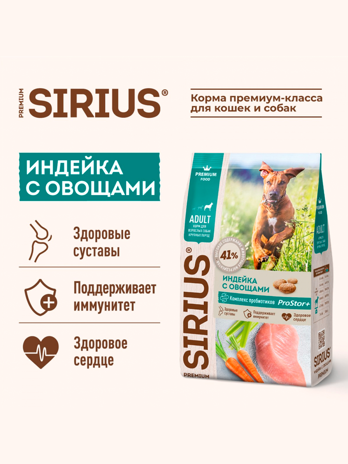 Сухой корм сириус SIRIUS PREMIUM для взрослых собак средних пород, индейка и утка с овощами, 2 кг