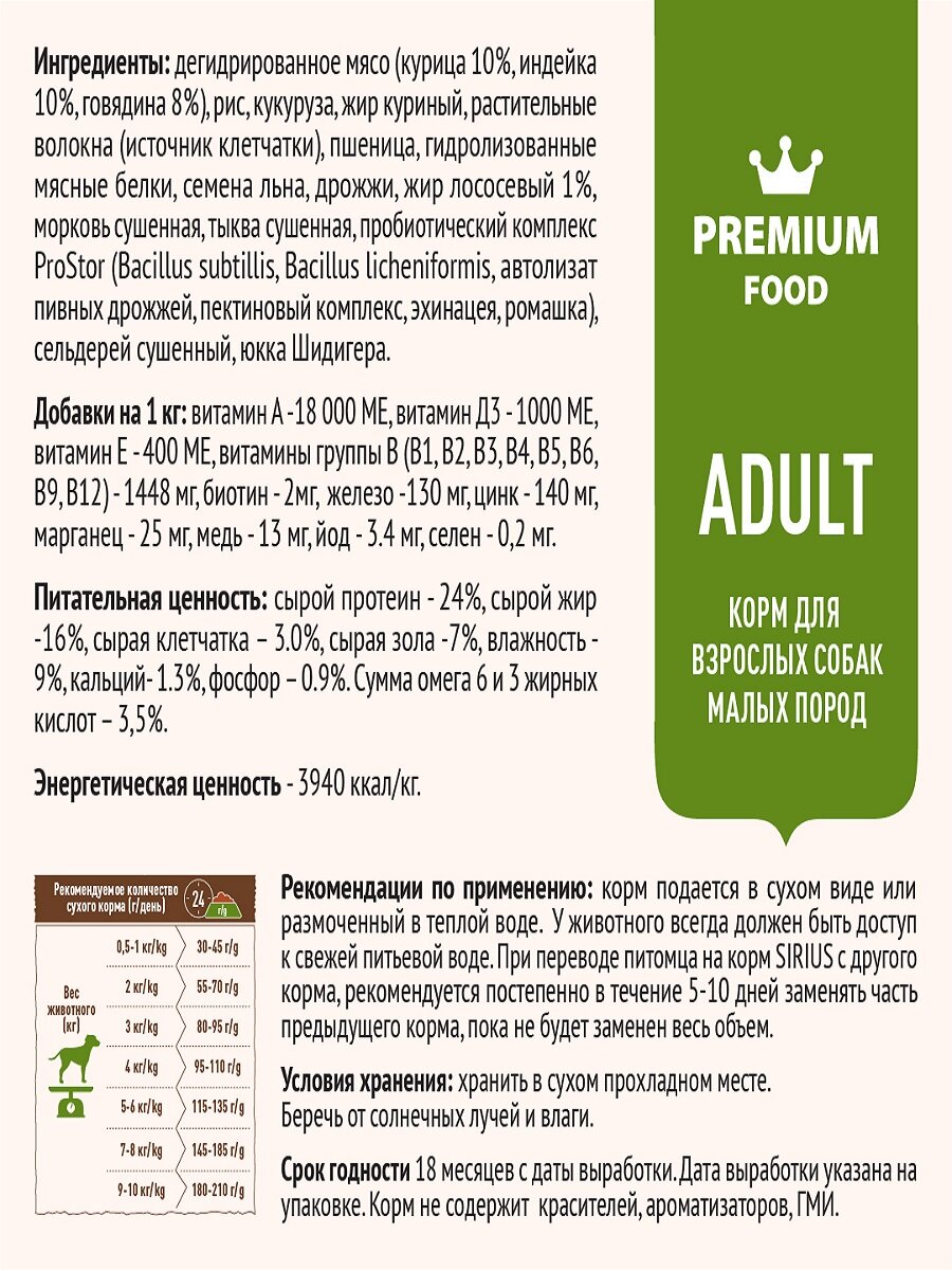 SIRIUS для взрослых собак маленьких пород с индейкой (2 кг)