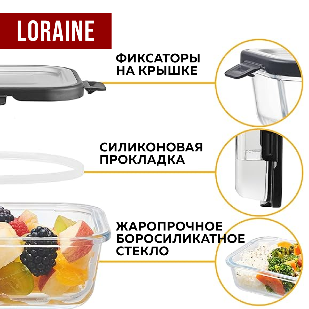 Купить Набор контейнеров для еды с крышкой LORAINE, стеклянные, прозрачные 26265