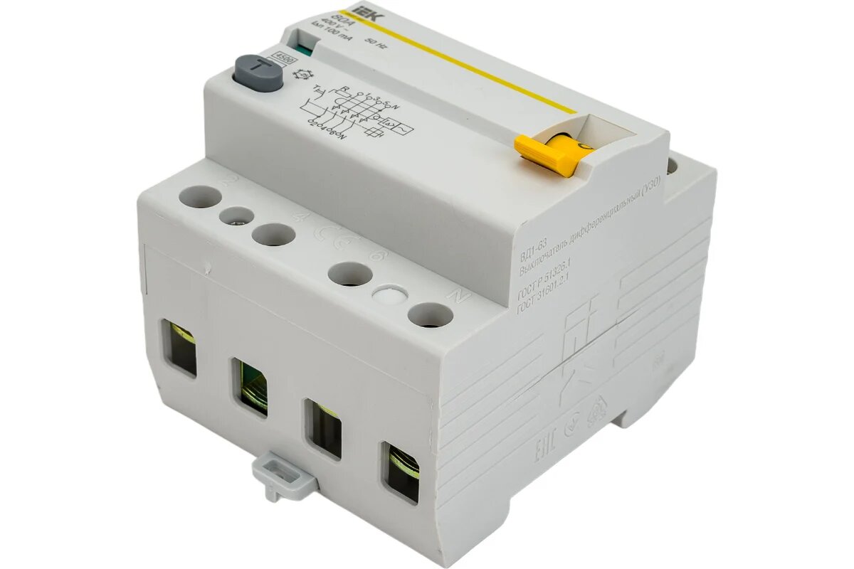 Электромеханический выключатель дифференциального тока (УЗО) Оригинал 4п трехфазное 63А 100мА тип AC тип АС ВД1-63 IEK ИЭК MDV10-4-063-100