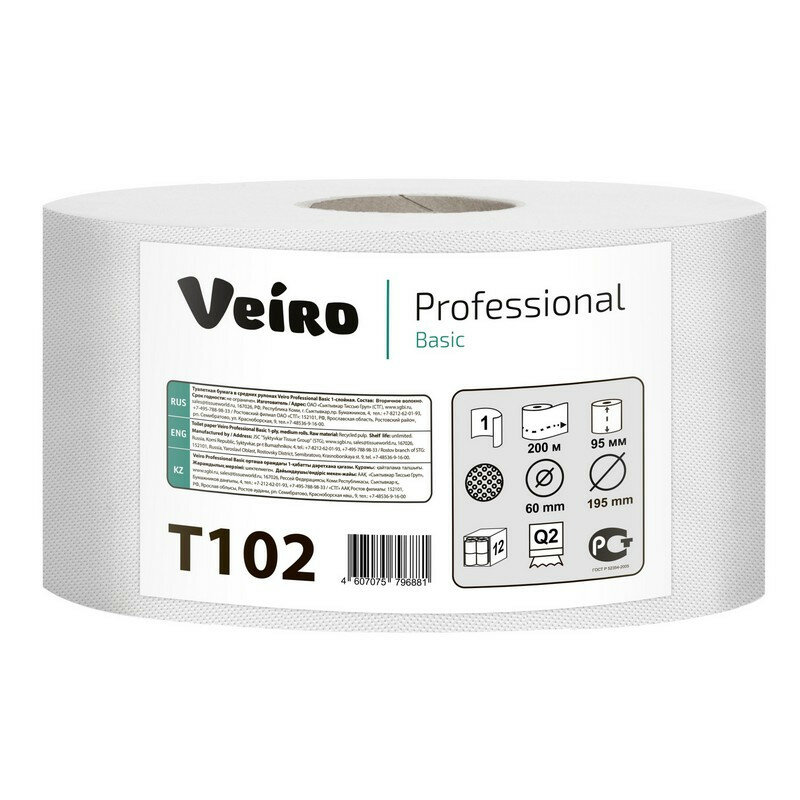 T102 Туалетная бумага в средних рулонах Veiro Professional Basic однослойная (12 рул х 200 м)