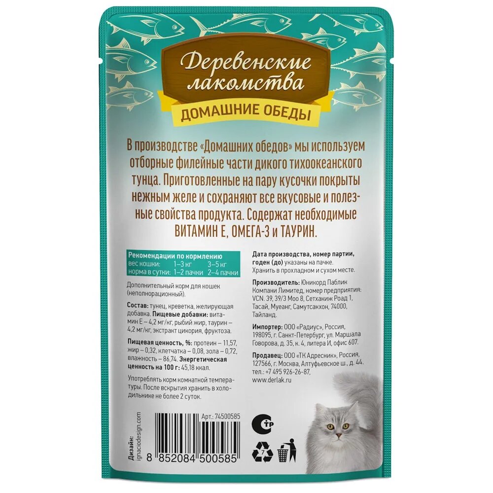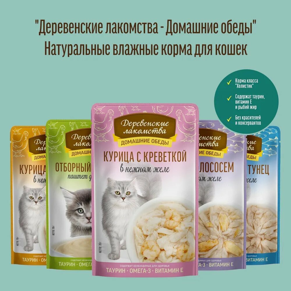 Деревенские лакомства Влажный корм для кошек Домашние обеды, тунец с креветкой в нежном желе, 70 г, 2 шт