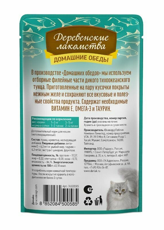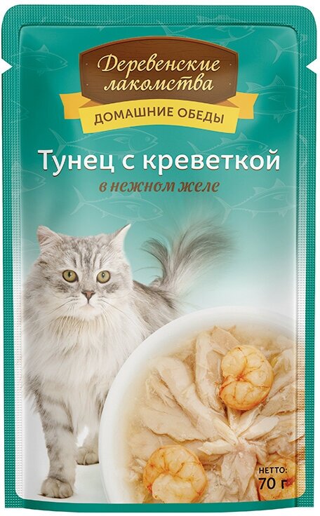 Корм для кошек деревенские лакомства Тунец с креветкой в нежном желе пауч 70г (упаковка - 12 шт)