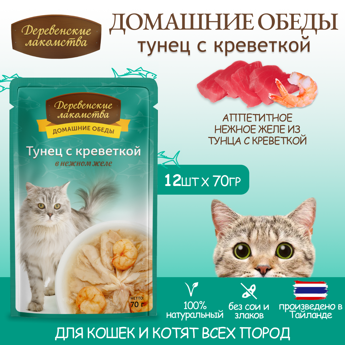 Деревенские лакомства домашние обеды для взрослых кошек с тунцом и креветкой в нежном желе 70 гр (70 гр х 12 шт)