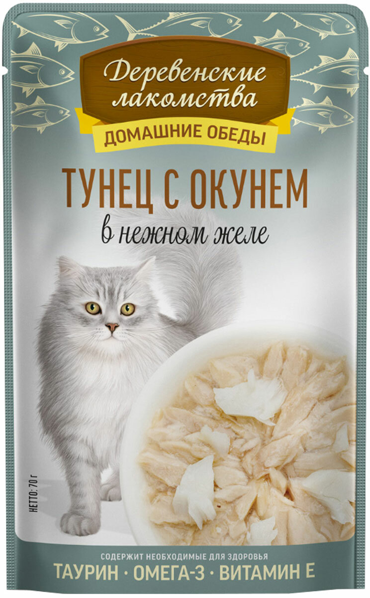 Купить Деревенские лакомства пауч для кошек (кусочки в нежном желе) Тунец и окунь, 70 г. упаковка 12 шт