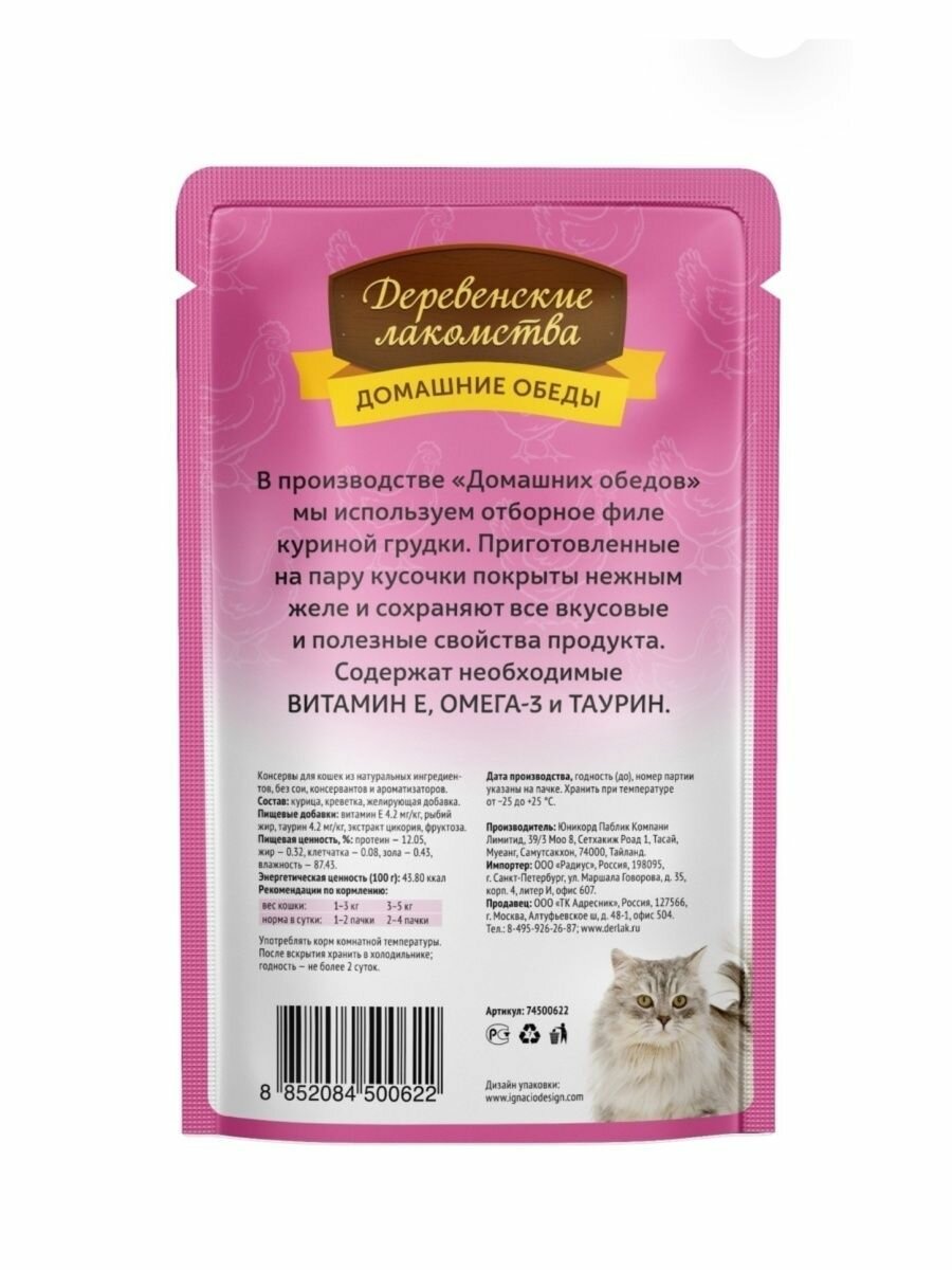 Корм для кошек Деревенские лакомства филе курица-креветка желе пауч 70г, 12 шт