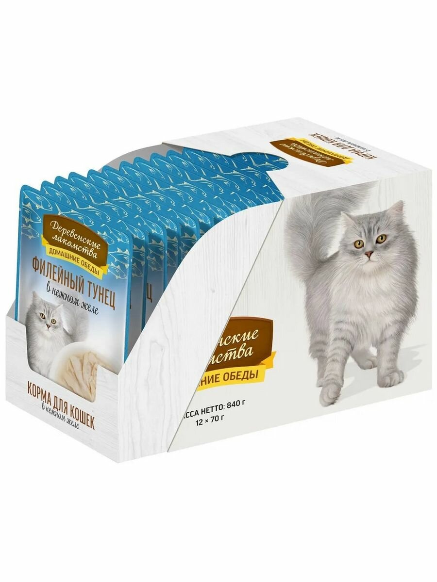 Корм для кошек деревенские лакомства Филейный тунец в нежном желе пауч 70г (упаковка - 12 шт)