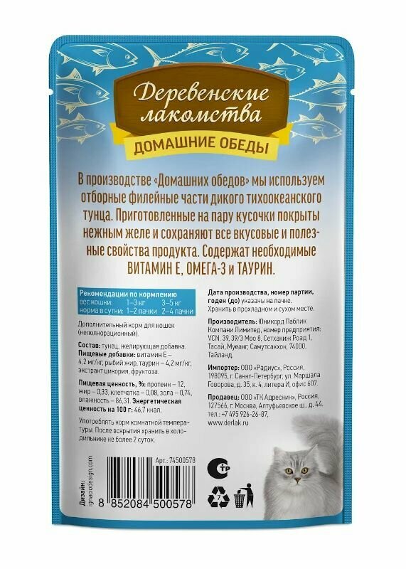 Сохранитькорм для кошек Деревенские лакомства Домашние обеды, беззерновой, с тунцом 12 шт. х 70 г (кусочки в желе) интересное: