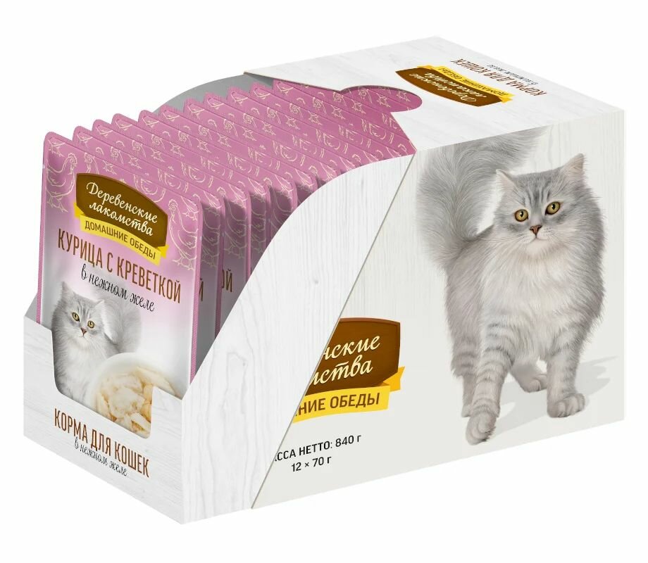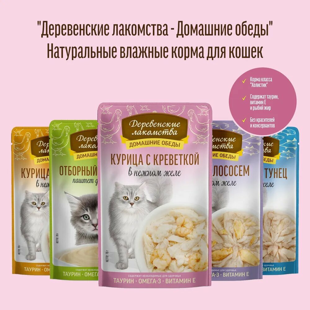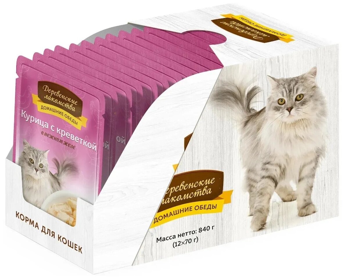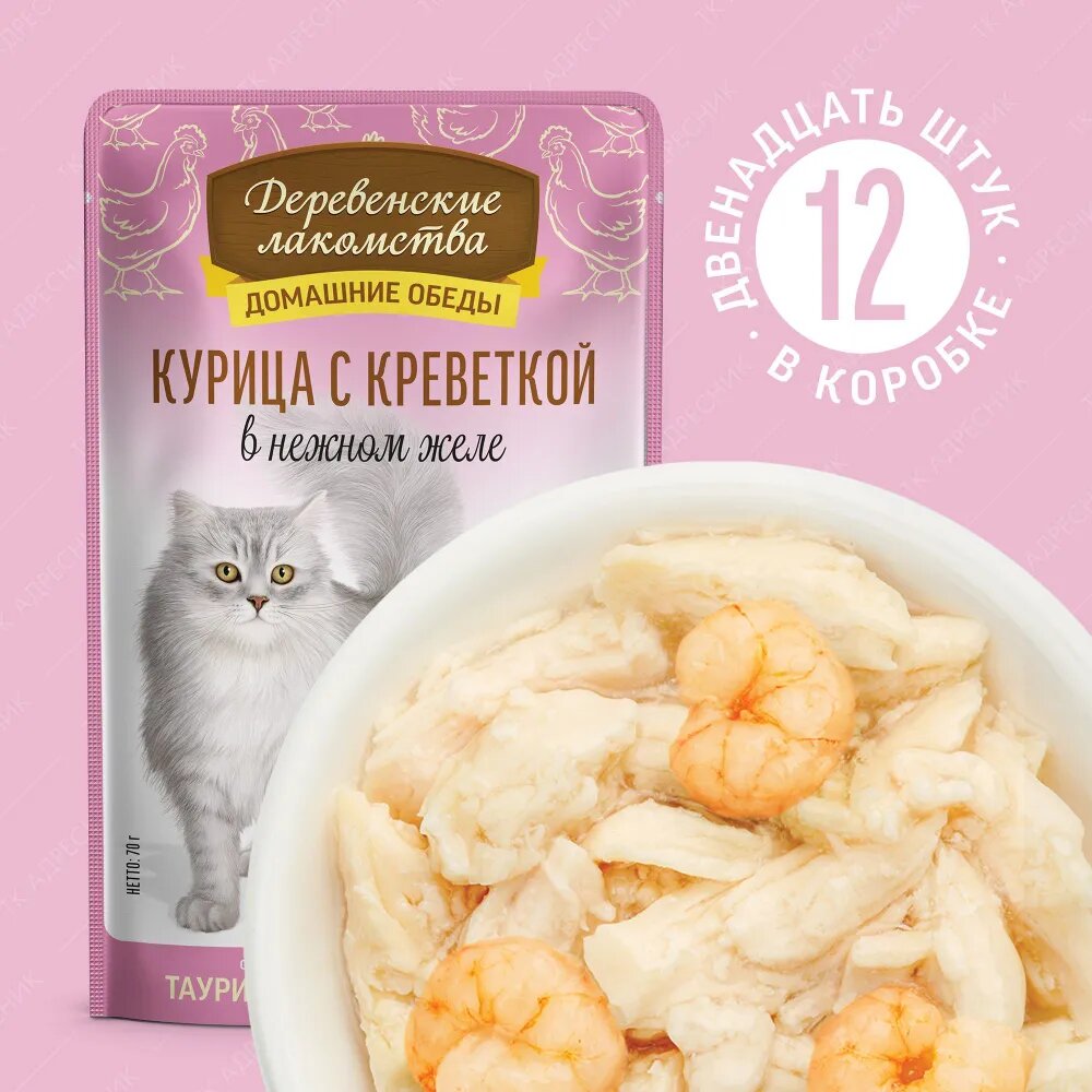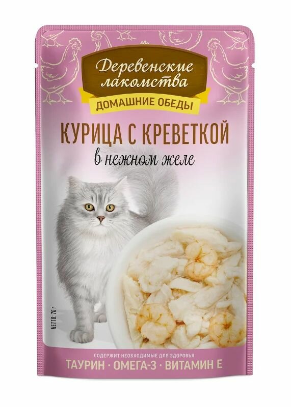 Купить Деревенские лакомства влажный корм пауч д/кошек Курица с креветкой в нежном желе 70г.×12шт.