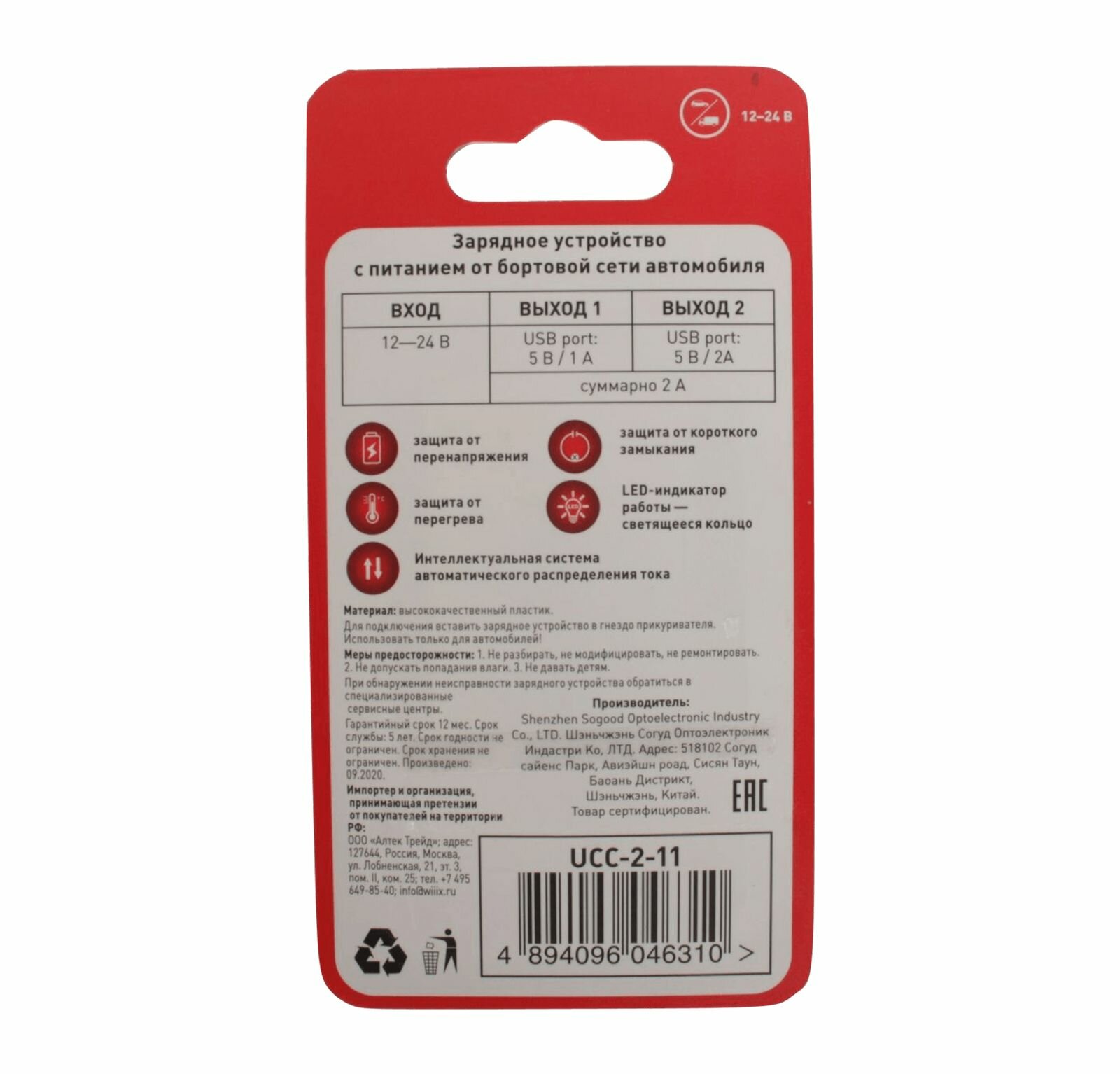 WIIIX UCC-2-11 Устройство зарядное в прикуриватеь 2USB 12V WIIIX